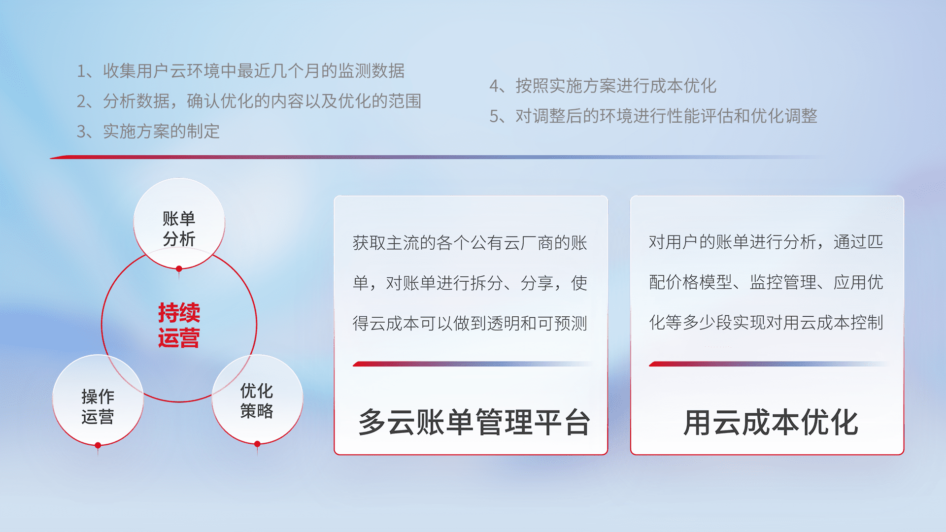 通过多云纳管,,,以统一的资源数据模型把客户的云资源进行抽象和封装,,进而实现对多云资源的统一操作,,保障云资源管理的可靠性、、、稳定性与可用性。。。。量身定制化运维内容,,配置、、、开发运维、、、、补丁管理、、、、备份、、、、监控、、、认证和访问管理、、、、审计和日常巡检等,,,保障在用云过程中的可靠度,,,稳定度以及高可用率。。。